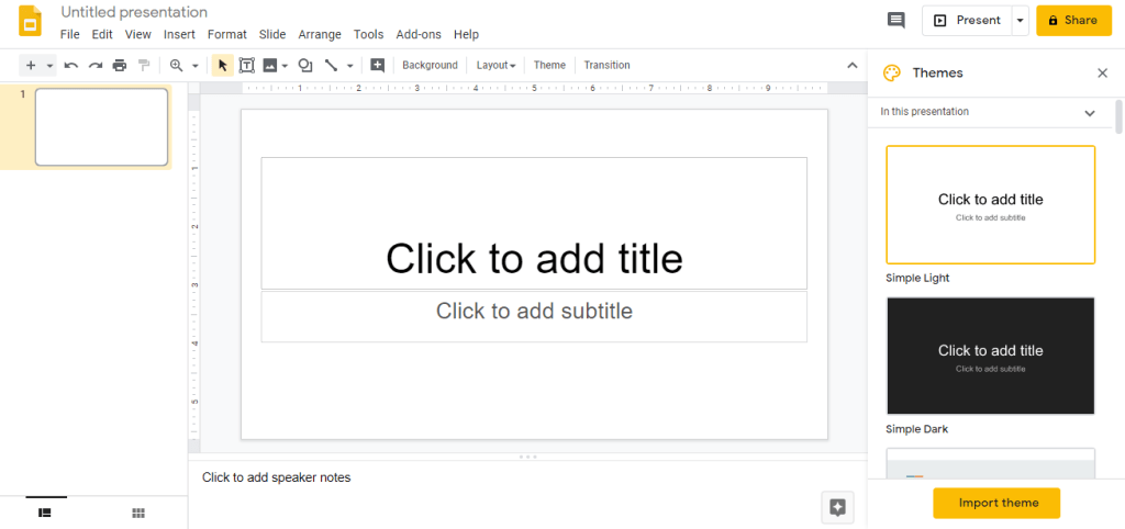 Akan terbuka otomatis sebuah laman untuk membuat presentasi dan kalian sudah bisa memulai untuk membuat presentasi dengan Google Slides.