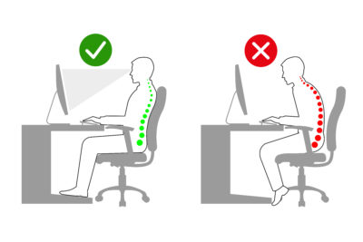 Postur duduk yang tepat bisa membuat terhindar dari masalah ini. Usahakan duduk dalam posisi pundak yang mundur dan santai. Posisikan badan secara tegak dengan lengan bagian bawah sejajar dengan permukaan meja dan keyboard.